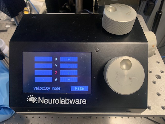 I the picture above, the z-axis is instructed to go to to -520 um, which exceeds the 500 um limit on down travel. Once an axis hits a limit, none of the motors will move until the scope is brought back to a position inside the bounding box. In the example above, the user will have to turn the knobs to specify a desired z-axis location above 500 um. Knobby will accept such a coordinate, move the objective to that location, and the motors will become responsive again.