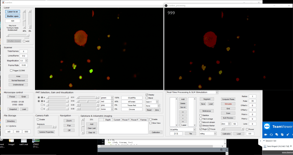 To run the example, simply run the Processing sketch alongside Scanbox. Then enable the “plugin” and “focus” checkboxes in Scanbox. The main advantage of this mechanism (over a Matlab plugin) is that it provides an easy interface to do shader processing on the incoming data stream. I am now working on real-time non-rigid image registration, cell segmentation and cell extraction for use in closed-loop experiments.