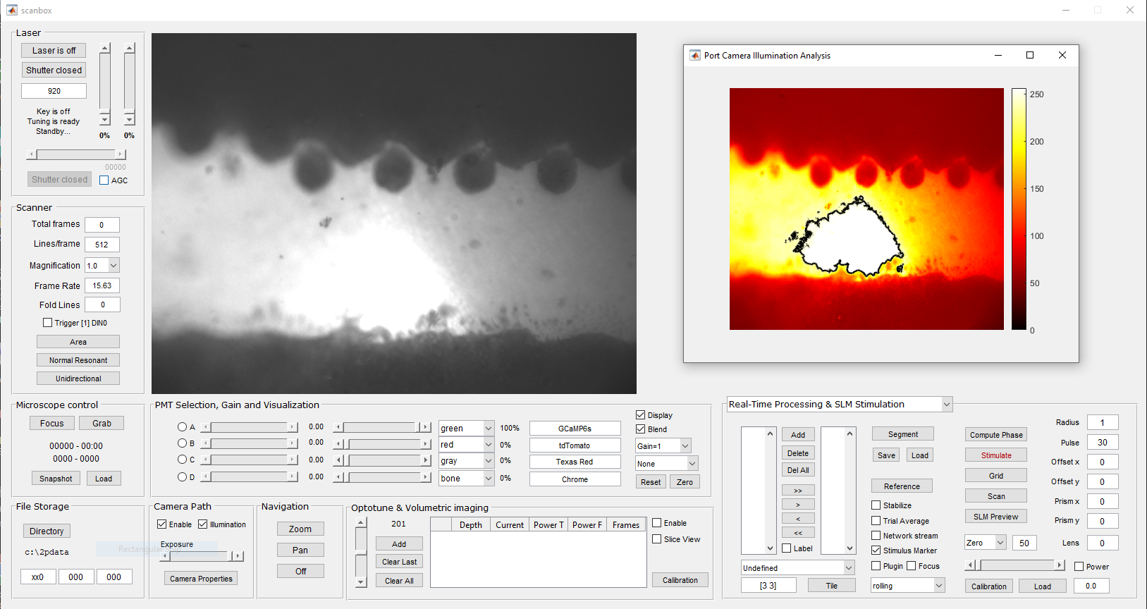 Here is an example of how it looks with the main Scanbox window and the illumination window showing the data side by side. The region inside the black contour is near saturation.