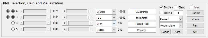 Either before or during scanning one can choose to alternate stimulation with the two sources by clicking the Mux checkbox in PMT Selection, Gain and Visualization panel. When active, the tunable laser source is used to scan the even frames and the fixed source is used to scan the odd frames. In this mode, one can toggle the frames being displayed by a toggle button located below the Mux checkbox. While one can visualize either odd or even frames during acquisition all the frames are being saved. Multiplexing works both in unidirectional and bidirectional modes.